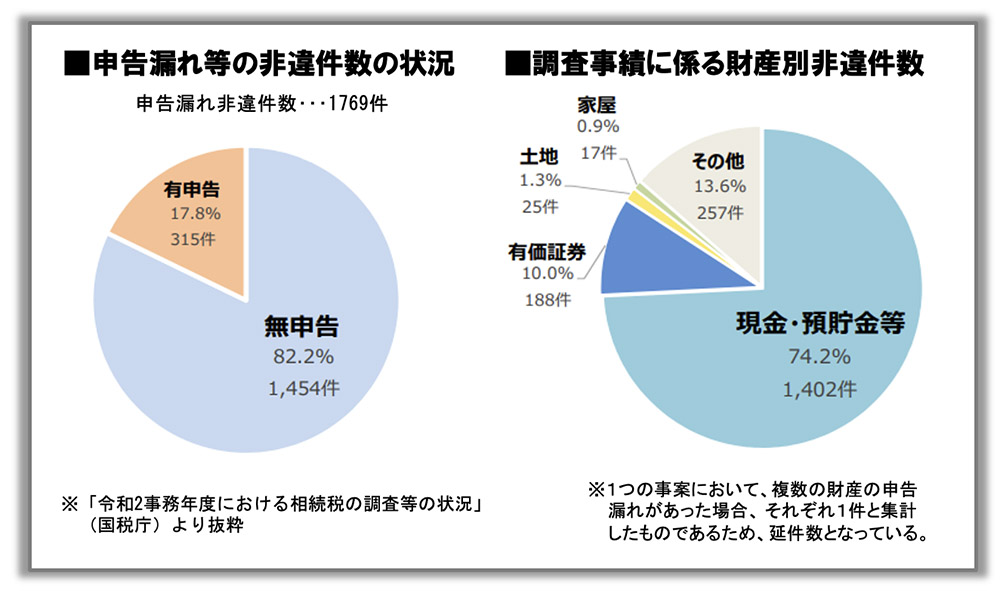 ※「令和2事務年度における相続税の調査等の状況」(国税庁)より抜粋。1つの事案において、複数の財産の申告漏れがあった場合、 それぞれ1件と集計したものであるため、延件数となっている。
